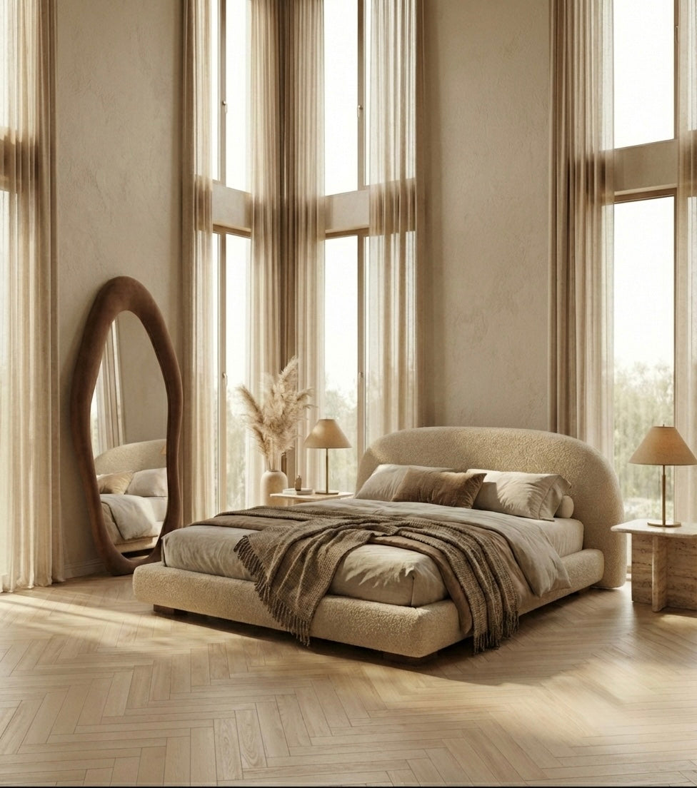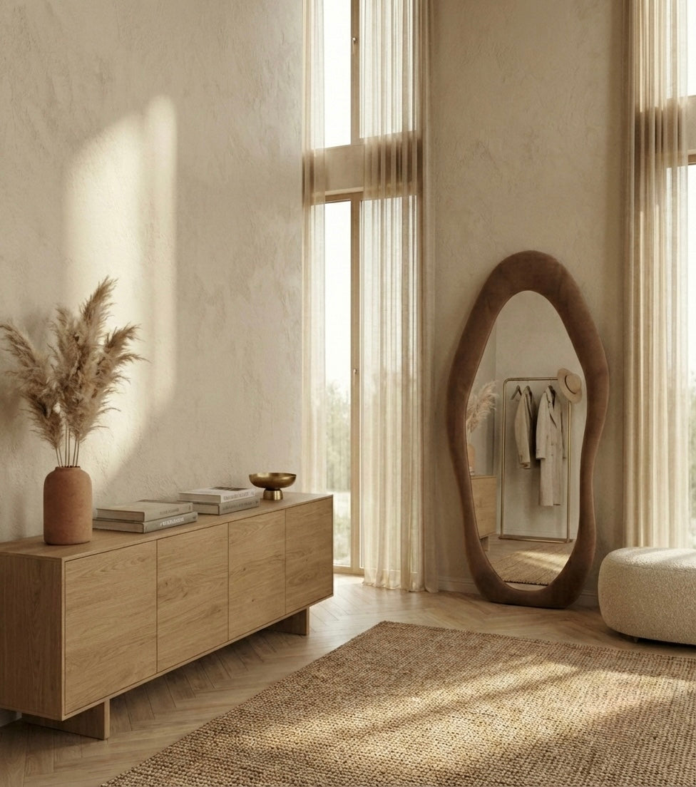 Add a stunning focal point to your bedroom with this full length wavy mirror featuring an irregular arched design. The beautiful wooden frame and unique wavy shape create an eye-catching piece that's both functional and decorative.